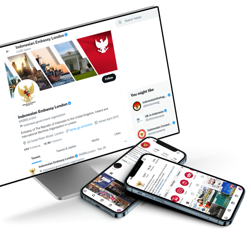 We manage the official social media accounts of KBRI London and KJRI Perth, developing editorial plans and consistently posting on Instagram, Facebook, and Twitter. Our team ensures that these accounts stay active and engaging, helping you effectively communicate with your audience and achieve your goals.